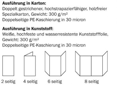 Der Druck erfolgt entweder auf spezialimprägniertem Karton, oder Kunststoff. Als Schutzfolie kommt eine sehr strapazierfähige Folie zum Einsatz.