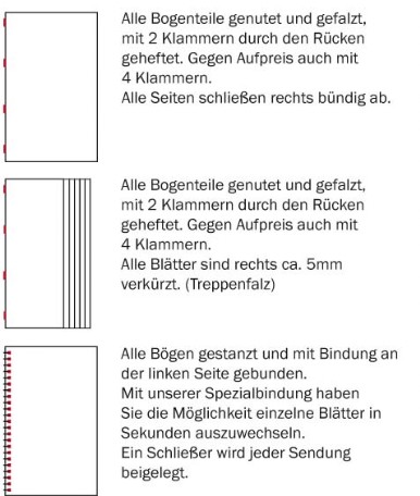 Sie haben die Auswahl aus gefalzten oder gebundenen Ausführungen. Als Bindung kommt entweder die klassische Klammerbindung, oder aber eine Spiralbindung zum Einsatz.